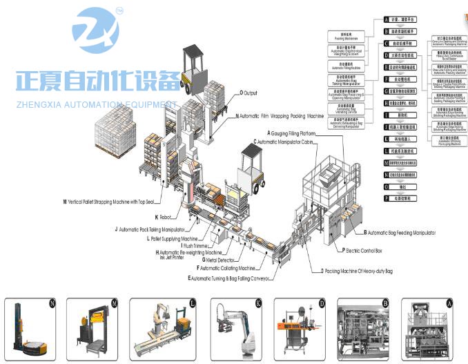 全自动码垛单元:输送→压平→转位→编组→推袋压袋→分层→升降→托盘和垛盘输送